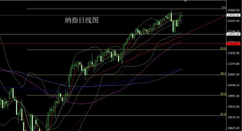 The Nasdaq market opened at 23316.84 yesterday and the market fell slightly. The market fluctuated strongly. The daily line reached the highest position of 23562.15 and then fell strongly. The daily line was at the lowest position of 23220.85 and then the market rose at the end of the trading session. The daily line finally closed at 23410.16 and then the market was in a strong position. A spindle pattern with an upper shadow line slightly longer than the lower shadow line closed. After such a pattern ended, the stop loss was 23230 after more than 23290 today, with the target of 23350 and 23400 and 23450-23500.