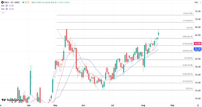 XM Hong Kong Stocks: Leapmotor (09863.HK) further hit its high since mid-May this morning and is waiting for the first half of the year to be announced today. Leapmotor has doubled since January this year, surpassing its well-known peers Xiaopeng Motors and Xiaomi Group, and has soared by more than 200% from its lows in August last year.