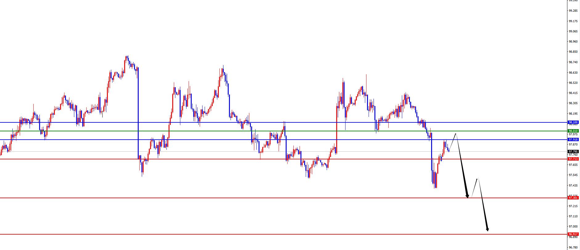 De un análisis de múltiples ciclos, el precio se ha consolidado recientemente en el nivel semanal. Actualmente, la resistencia semanal se encuentra en el área de 97.90, y el precio tiene un hombro corto por debajo de esta posición. El precio solo girará mucho después del cierre semanal posterior por encima de esta posición. Desde el nivel diario, a medida que pasa el tiempo, la resistencia diaria se encuentra actualmente en el área 98.10, y el precio es actualmente bajista por debajo de esta posición. Recientemente, el precio se ha consolidado hacia arriba y hacia abajo en una posición clave en la línea diaria. En términos de operación, debe prestar atención al ritmo de cuatro horas. Desde la perspectiva de cuatro horas, la resistencia actual de cuatro horas está en el área 98. El precio es corto en esta posición. Es corto antes de que el precio se rompa a través de la resistencia de cuatro horas. Si se rompe más tarde, debe cambiar a tiempo. En la actualidad, se trata temporalmente en el método de negociación del lado derecho.