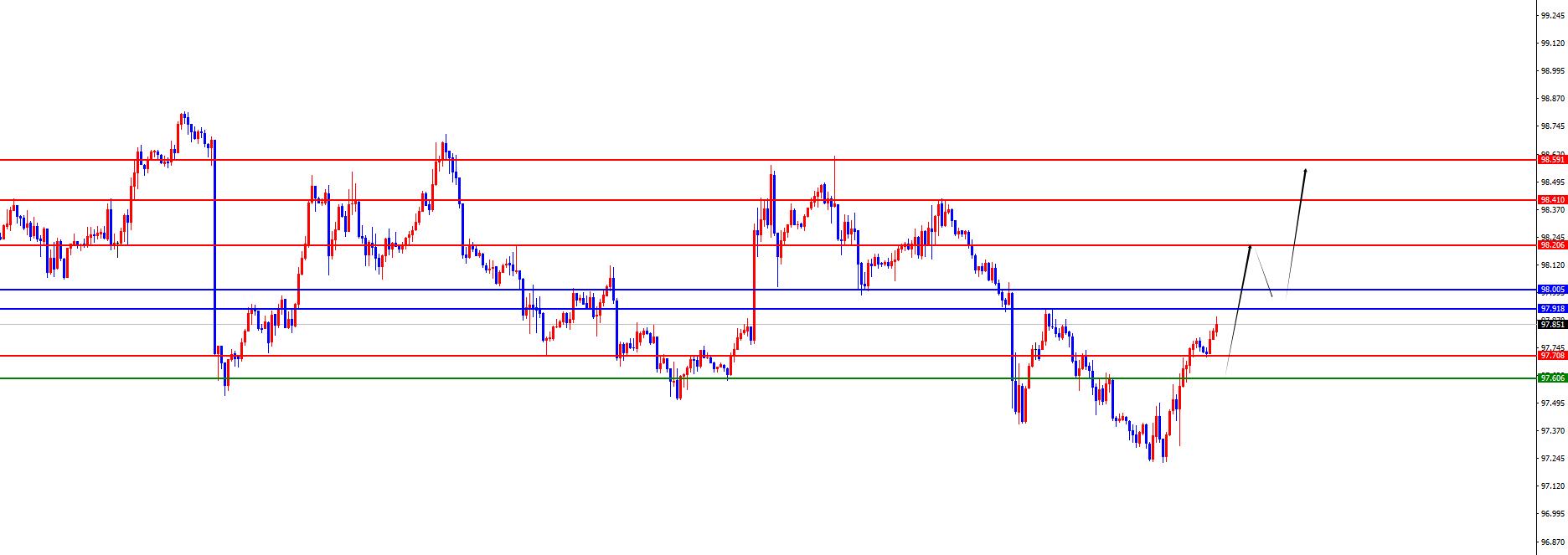 De un análisis de múltiples ciclos, el precio se ha consolidado recientemente en el nivel semanal. Actualmente, la resistencia semanal se encuentra en el área de 97.90, y el precio tiene un hombro corto por debajo de esta posición. El precio solo girará mucho después del cierre semanal posterior por encima de esta posición. Desde el nivel diario, a medida que pasa el tiempo, la línea diaria actualmente enfrenta resistencia en el área 98, y el precio es actualmente bajista por debajo de esta posición. Recientemente, el precio se ha consolidado hacia arriba y hacia abajo en una posición clave en la línea diaria. En términos de operación, debe prestar atención al ritmo de cuatro horas. Desde la perspectiva de cuatro horas, el precio de ayer atravesó la resistencia de cuatro horas, por lo que la resistencia a corto plazo se ha convertido en apoyo. Actualmente, el soporte de cuatro horas es www.xmaccount.compatible con el área 97.60-70. En el futuro, nos centraremos en el rendimiento del avance de la resistencia diaria y semanal. Una vez que nos atravesamos y nos mantenemos firmes, podemos continuar mirando hacia arriba. A corto plazo, nos centraremos temporalmente en el área 98.20-98.40-98.60.