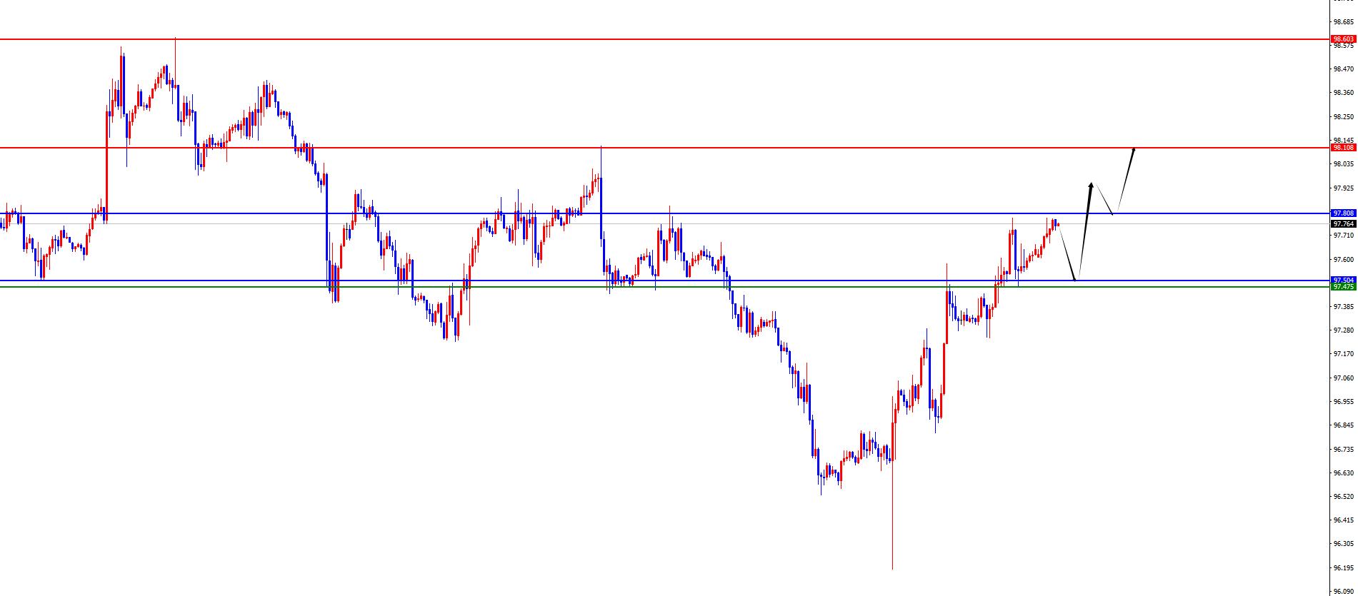 Da un'analisi multi-ciclo, il livello settimanale è stato recentemente un consolidamento chiave nella linea settimanale. Attualmente, la resistenza settimanale si trova nell'area 97.80. È importante prestare attenzione al fatto che questa posizione possa resistere questa settimana. Una volta che è fermo, i tori a medio termine continueranno. Dal livello giornaliero, con il passare del tempo, la linea giornaliera sta attualmente supportando l'area 97,50 e il prezzo è attualmente rotto. Seguendo il supporto in questa posizione, esaminerà ulteriormente l'ascesa. Dal punto di vista di quattro ore, la resistenza di quattro ore è passata durante la notte mercoledì scorso, e poi il prezzo è aumentato in base al supporto di quattro ore. Attualmente, il supporto di quattro ore è a 97,50. Il prezzo è attualmente rialzista sopra questa posizione e l'attenzione successiva è sull'effettiva stabilità della resistenza settimanale. I prezzi fluttuano e aumentano a breve termine un'ora. Attualmente, l'attenzione è rivolta al supporto nell'intervallo 97.50-60 e una volta rotta la resistenza settimanale, continuerà a continuare.