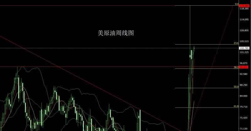 La. Il mercato del petrolio greggio statunitense ha aperto in rialzo la scorsa settimana a 100.313, poi il mercato prima è salito per raggiungere un massimo settimanale di 102.175, per poi scendere fortemente. Il minimo settimanale ha raggiunto una posizione di 84.794, quindi il mercato ha oscillato ed è aumentato fortemente. La linea settimanale ha finalmente chiuso a Dopo la posizione di 101.14, la linea settimanale ha chiuso sotto forma di una stella mattutina con un'ombra inferiore molto lunga e poi è tornato a 100,15 con uno stop loss di 99,6. L'obiettivo è 101, 102, 103 e 104.