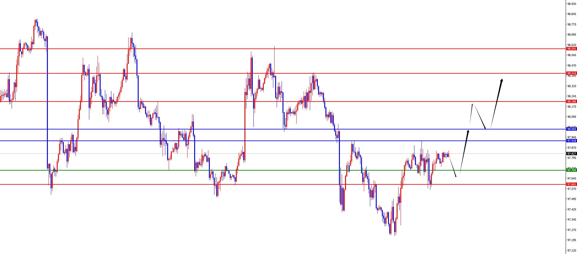 다중주기 분석에서 가격은 최근 주간 수준에서 위아래로 통합되었습니다. 현재 주간 저항은 97.90 지역에 있으며 가격은이 위치보다 짧습니다. 가격은이 후속 주간 마감 후이 위치를 초과 한 후에야만 진행됩니다. 일일 수준에서 시간이 지남에 따라 현재 일일 저항은 98 영역에 있습니다. 현재 가격이 매일 및 주간 공명 저항을 안정화시킬 수 있는지 여부에주의를 기울여야합니다. 4 시간의 관점에서, 어제, 예정대로 4 시간의 지원으로 되돌아 가면서 더욱 증가했습니다. 현재 가격은 여전히 4 시간의 지원보다 높습니다. 오늘날, 97.60-70 범위의 지원에 중점을두고 있으며, 위의 97.90-98 범위가 안정화되었습니다. 첫 시간에 단기 변동은 현재 변동성이 상승하고 있으므로 미래에 안정된 후에 가격이 상승하기 전에지지가 상승하기를 계속 기다리십시오.
