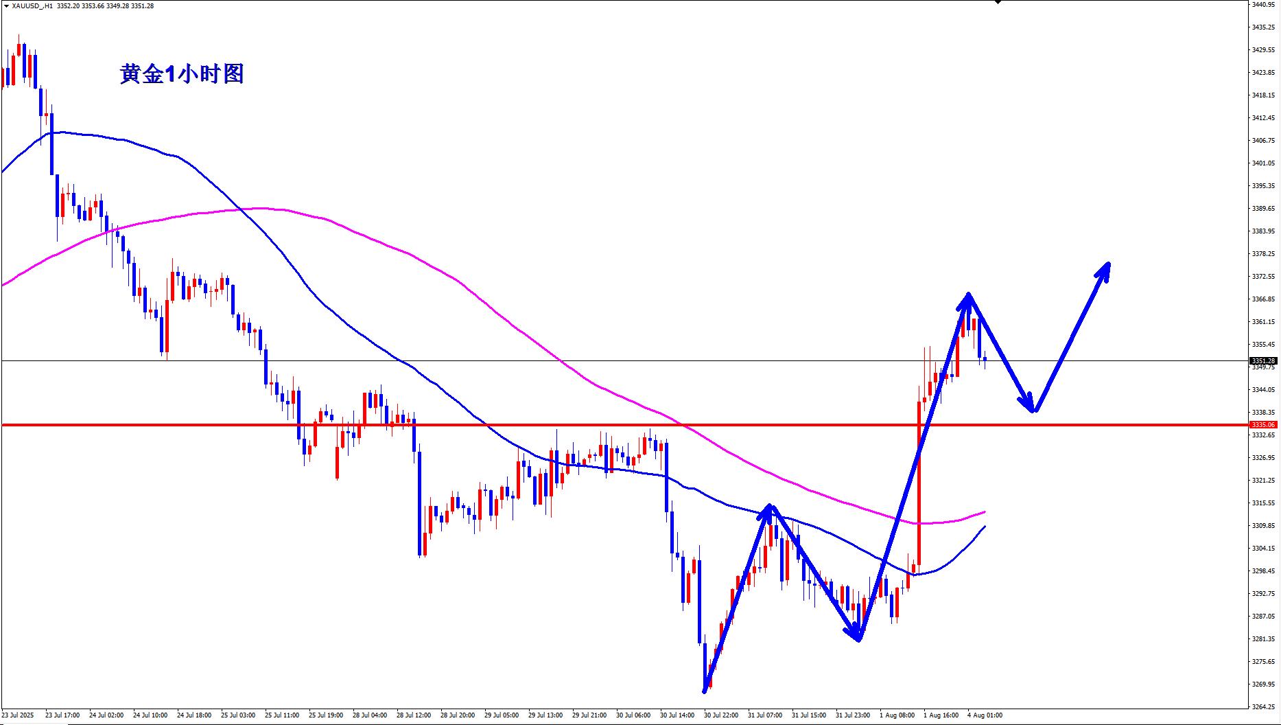 黄金1小时均线已经向上拐头,可能即将形成向上的金叉,黄金多头已经积蓄量能,黄金走势上1小时底部双重底,然后直接深V突破前期平台3335一线,黄金短线3335已经形成有效之后,早盘回落3335上逢低做多。
