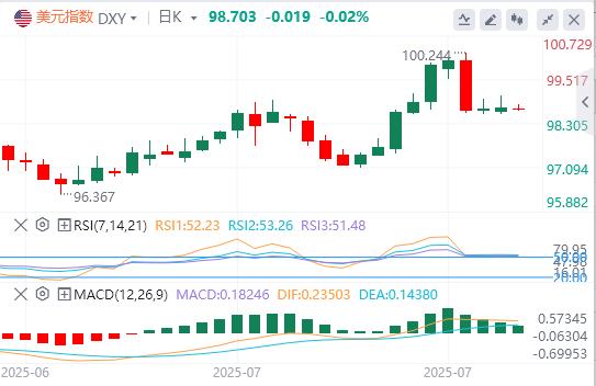 周二,美元指数维持区间震荡,在美国服务业PMI数据公布后短线下挫,抹去日内大部分涨幅,截至目前,美元报价98.70