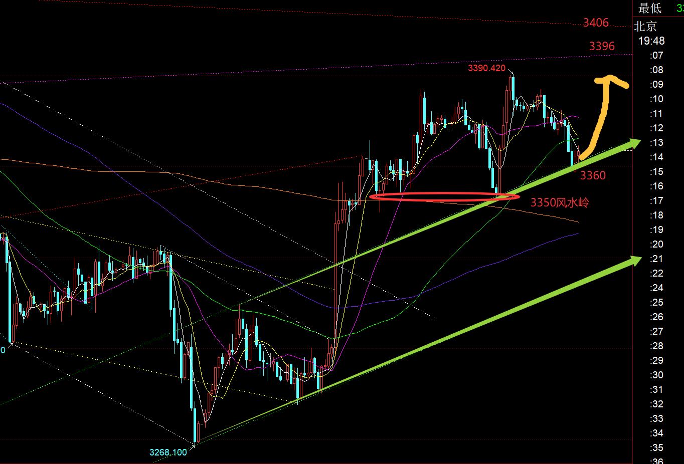 不管如何,先应对好当下,再走一步看一步,先3360一线,或3360-3355支撑上尝试继续看涨,下破3350则失败,上方关注小时线中轨3375,能突破站上它,则有望破3390概率;