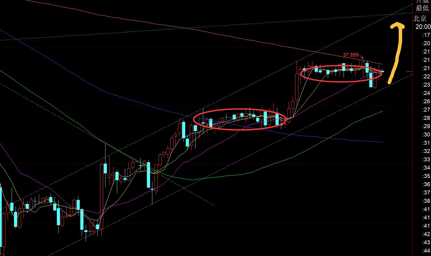 第二,白银方面:昨日亚欧盘一路窄幅横盘,美盘发力继续拉升上破,最高触及37.9一线,也是成功到位试探日线中轨和10均线的共振点;
