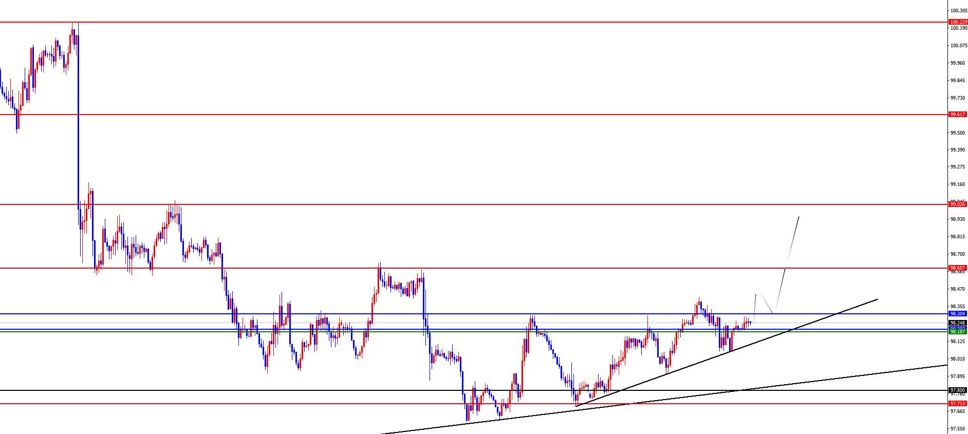 从多周期分析,周线级别来看近期价格在周线支撑上下盘整,本周重点关注98.30位置站稳,一旦站稳则中期多头将延续上行。在日线级别上,在上周价格压制在日线阻力位置下方持续震荡,目前日线阻力于98.20位置,目前在此区域震荡,后续关注进一步突破上涨。从四小时上看,四小时上是我们一直强调短期价格走势的关键,目前价格依旧在四小时支撑98.20上方,所以暂时短期依旧偏多。从一小时上看,观察下方图表趋势线可以看到,目前短线先关注98.10-20区间支撑,上方关注98.60-99区域。