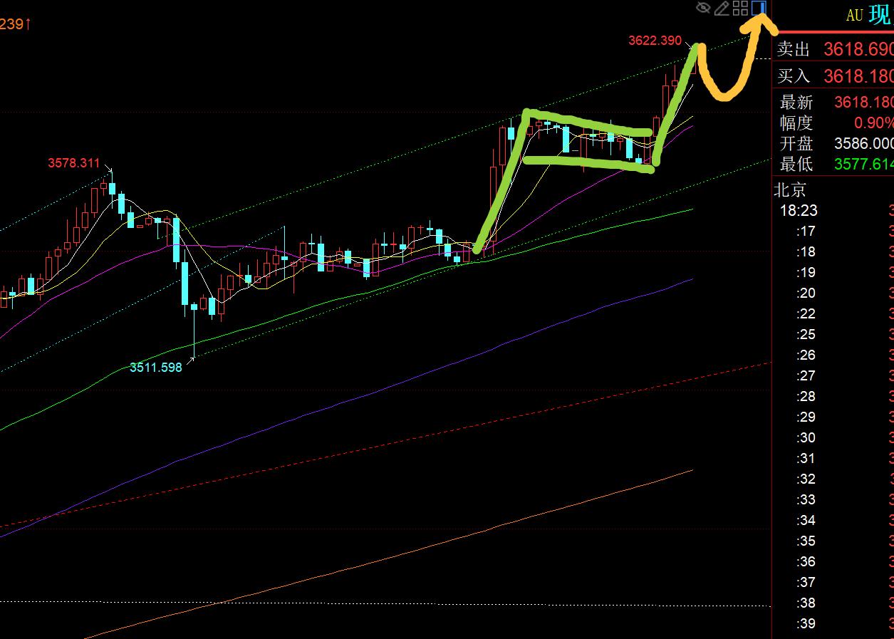 第四,黄金小时线级别:隔夜强势破高至3600继续走强,那么今日早间先回测就应该继续去跟随这一波涨势;而作为单边强势来讲,一般回踩最多50分割位置,大部分382分割位置就会企稳;今日早间回踩的低点3578刚好是382分割点,然后又是出现一路横盘,强势中横盘不跌是通过时间来修复一定的背离和超买,等靠拢小时线中轨就基本是一个首要试探看涨的支撑点,因此午后3580一线触及到位,是可以先去尝试继续看涨,若还有低位去50分割点,再继续补一些即可;单边强势多头拉升格局下,不要恐高,也没必要恐高,因为都是顺势,而顺势往往都容易发力;只要你心中一直坚信多头趋势,坚信单边上涨,你就不会恐高,看到回踩了眼里就是钱的光;相反,但凡你心中有空的想法,或臆想,是不敢高位去跟随看涨的,只会一步又一步的踏空,反而去不断试探高空,不断被打出局,这就是节奏和方向的问题;午后3580跟随看涨之后,欧盘成功拉升,突破3600站上进一步发力,一下子3610到位,30米空间可以把握的,此时又冲值3622高度,势头非常猛,继续只多不空原则,耐心等今晚美盘前后出现诱空来把握二次看涨点;首要支撑则是顶底位置3600一线,也是靠拢中轨上移点,再结合3580-3622这一波分割来看,3606、3601、3595都有支撑(前提是假设3622暂时承压进行回落修正),所以回踩确认它们,以中轴3600上下作为支撑节点,择机继续二次看涨,目标可以反复看新高,按照上升旗形等同涨幅来看,有望指向3630一线;