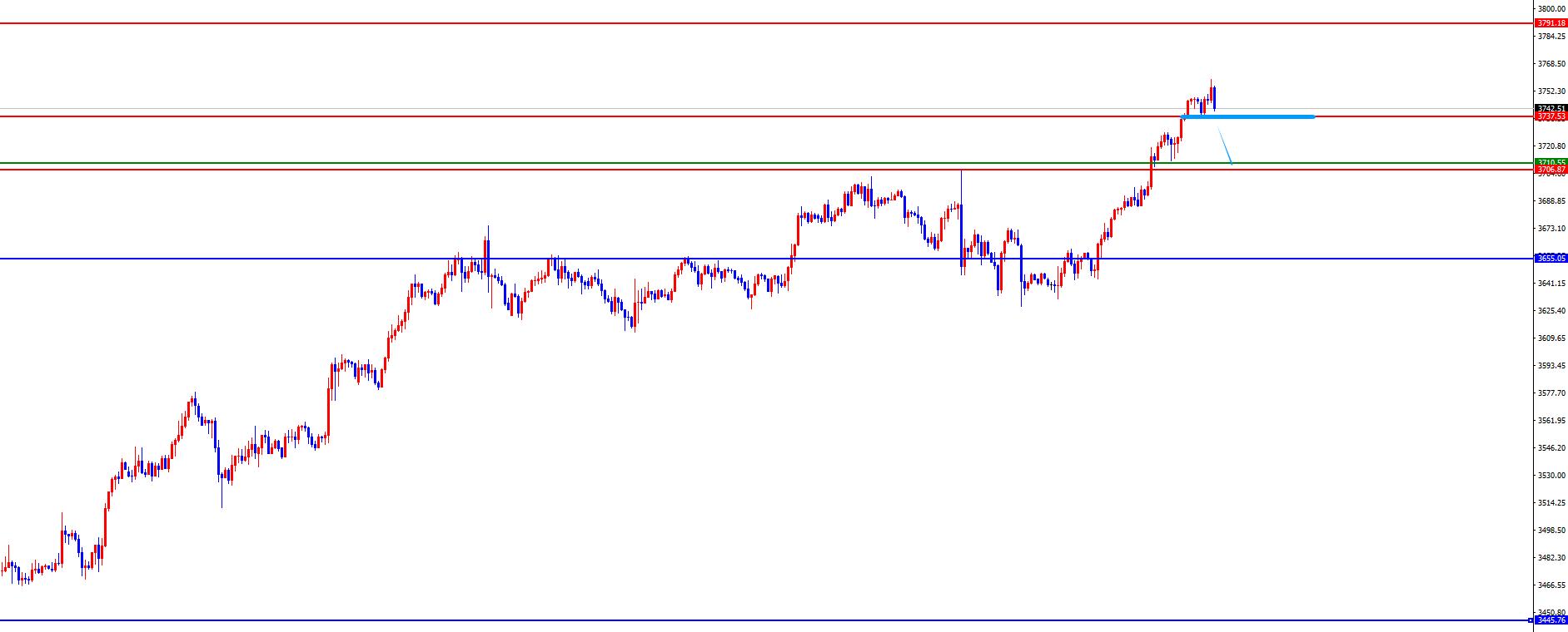 从多周期分析,首先观察月线节奏,月线上价格8月份大阳收尾,整体看价格依旧多头运行,从长线上看3000位置是长线走势的分水岭,价格在此位置之上长线多对待即可。从周线级别看,价格经过近期持续震荡后突破关键阻力,目前持续再创历史新高位置,目前周线多空分水岭于3445位置,价格在此位置之上中线多对待即可。从日线级别看,暂时需要关注3655区域支撑,此位置之上波段多对待。从四小时上看,上周五价格突破四小时阻力,目前需要关注3706-3710区间支撑,则短线价格偏多。一小时上黄金早盘再度强势上破前一日高点位置,但是对于目前一小时上是有调整的表现,所以暂时先关注早盘低点得失,一旦下破则需要关注调整测试四小时支撑位置,在没有下破前暂时还是谨慎对待。