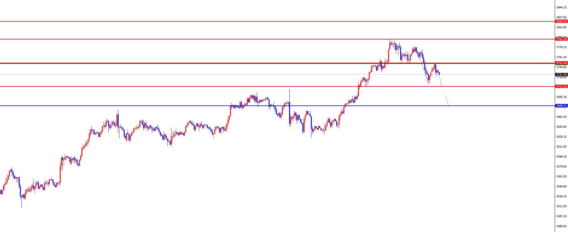 从多周期分析,首先观察月线节奏,月线上价格8月份大阳收尾,整体看价格依旧多头运行,从长线上看3000位置是长线走势的分水岭,价格在此位置之上长线多对待即可。从周线级别看,价格经过近期持续震荡后突破关键阻力,目前持续再创历史新高位置,目前周线多空分水岭于3445位置,价格在此位置之上中线多对待即可。从日线级别看,暂时需要关注3680区域支撑,此位置之上波段多对待。从四小时上看,昨日价格跌破四小时支撑3750位置,则此位置变成目前关键阻力,后续关注此区域先承压下跌。一小时上目前呈现震荡下跌,所以后续持续先关注承压,下方关注3712-3680区域支撑。