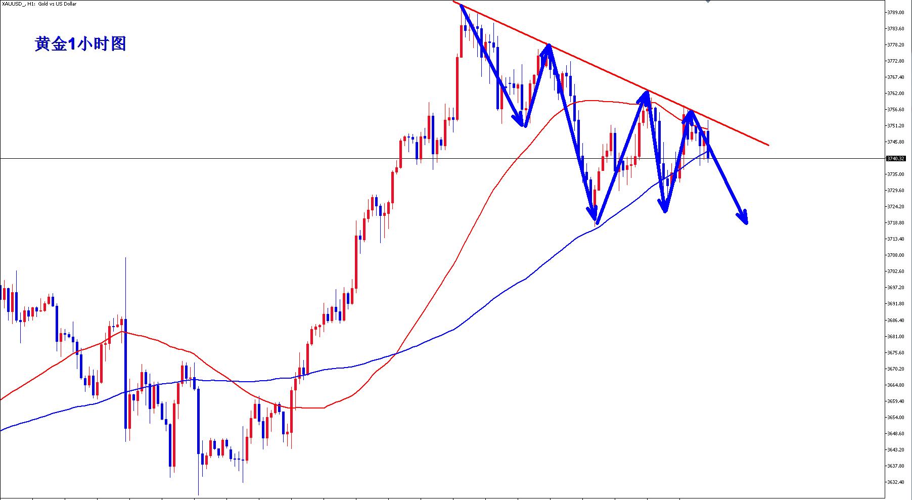 黄金1小时均线还是继续向下拐头,而且一旦形成向下的死叉,那么黄金卡空头可能将持续发力,黄金1小时虽然是震荡,不过整体已经开始震荡向下,黄金1小时每次反弹都是承压向下趋势线就开始下跌,现在下行趋势压制已经下移到3753附近,早盘反弹承压3753继续逢高空。