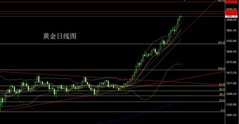 昨日黄金市场延续拉升过程,早盘开盘在3960.2的位置后行情先拉升给出了3977.5的位置后行情冲高回落,日线最低给到了3940.7的位置后行情快速拉升,日线最高触及到了3991.3的历史新高后行情整理,日线最终收线在了3984.6的位置后行情以一根下影线很长的中阳线收线,而这样的形态收尾后,今日的行情势必要冲击4000大整数关口,点位上,下方3325和3322的多和上周3368-3370的多和3377和3385多和3563的多减仓后止损跟进在3650持有,今日的行情如果先回落3965多止损3959,目标看3992和4000,破位的话上方看4012和4023和4032压力尝试短期获利了结空单。