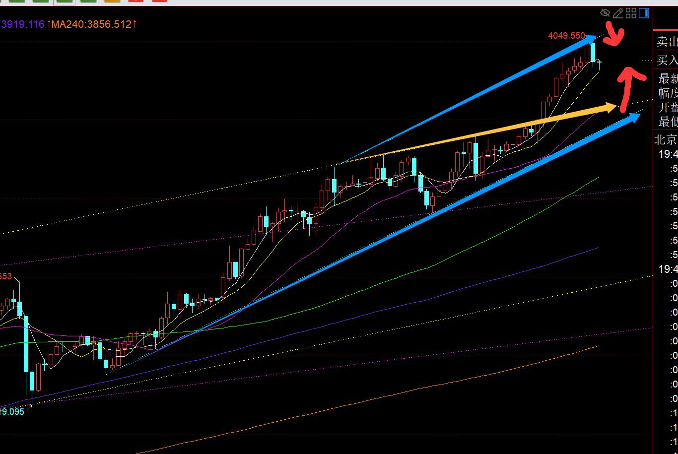 第一,黄金日线级别:昨日后半夜并未压制回踩,而是继续慢慢拉高收盘于相对高位,收盘价开始有所脱离5均线,而今日直接强势续涨一波,4000关口轻松越过,最高当前冲击了4050一线,离5均线更加逐步远离,相差接近100米,有所小加速上冲的迹象;这可能想在假期最后一日强拉一波,明日假期过后,就要谨防内盘开市之后的获利了结,从而打压金价展开修正,也只有回补确认5均线到位,或刺破5日,守住10日,才能再次给不错的上车低位,继续维持趋势拉升上涨;所以,趋势虽依然很强,但这两日还是需谨慎追涨,踏空了从3980至4050这一波拉升利润没关系,只要趋势一直在,后续高度还会更高,空间依然足够,耐心等回踩确认支撑到位之后,再一路去顺势跟随多头;