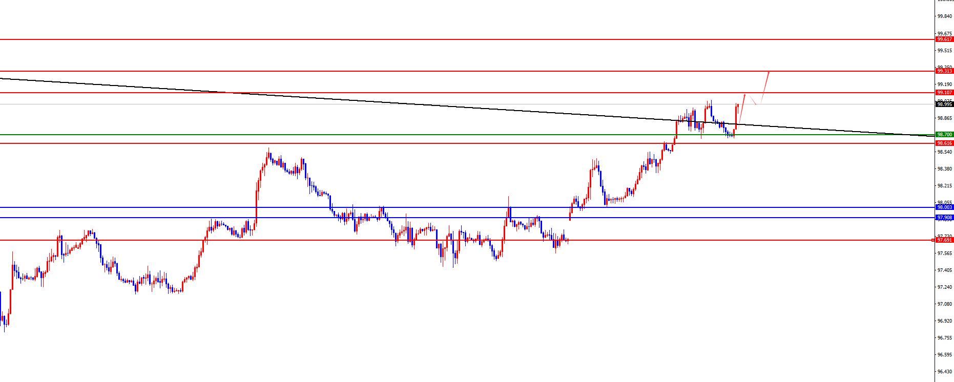 从多周期分析,周线级别来看近期价格在周线关键上下盘整,目前周线支撑于97.90区域,后续持续关注价格周线收盘在此位置上方,一旦收盘在此位置上方则后续将中线发力上涨。从日线级别看,随着时间的推移目前日线支撑于98区域,价格此位置之上波段进一步上涨。从四小时上看,在上周初价格承压于四小时阻力位置,在上周四价格突破上涨,之后周五再度回踩至日线及四小时支撑,整体目前四小时支撑于98.60-70位置,价格在此位置之上短线维持多。一小时上价格在昨日强调的趋势线附近震荡,目前短线依旧偏多,所以暂时在四小时支撑没有下破前维持多,只有下破后才看回补缺口,暂时先俺右侧交易方式对待即可。