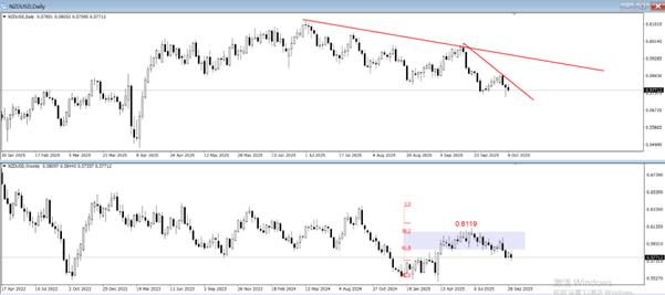 上图为NZDUSD日线(上)和周线(下)的叠加图。日线级别呈现波浪下跌模式,每一轮下跌波之后,都会出现比较显著的反弹波段。虽然中期趋势是空头,但由于频繁出现反弹波段,导致操作NZDUSD的短线交易并不顺利,需要时刻警惕行情触底反弹。