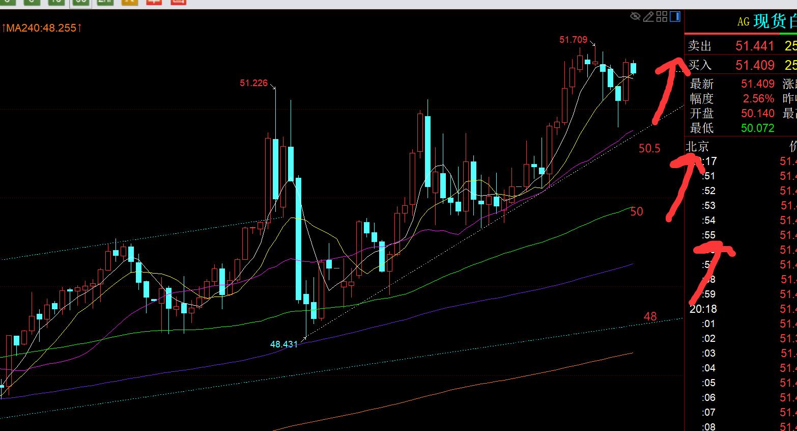 第二,白银方面:波幅这两日急速扩大,日内稍微动一下就是0.4-0.5,上周五亚盘提及,突破50后胆大的可直接追涨,目标51到位,只是当时防守的确不好带,除非波段;欧盘大幅连阳拉升,再次冲击隔夜高点51.1-51.2,则美盘前后跟随看涨,只是比较可惜,回踩稍多了一点,刚好刺破再美盘拉升抵达原先目标;