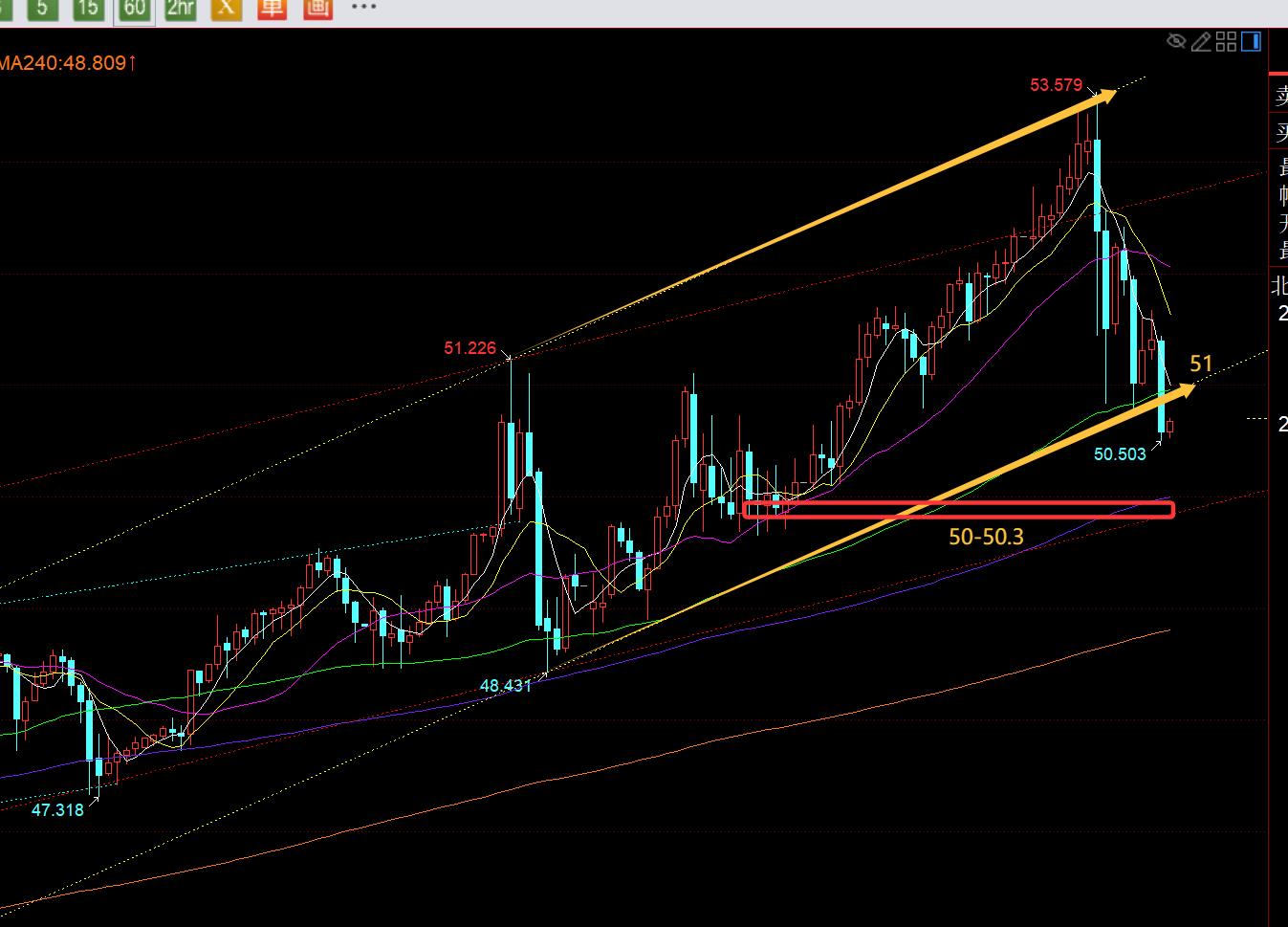 白银方面:欧盘震荡打压一波,触及图中黄色通道下轨51支撑,反弹了一波,随后又打压破了新低至50.5,这个位置逐步靠近日线5均线50.3;因此,白银来讲,它有些一步修正到位的迹象,而日线只要维持5日之上,依然是强势单边慢涨拉升中;因此,今晚留意50.3上下企稳看涨反弹;或者重新突破51,回到黄色通道之内,再回踩确认下轨企稳去跟随反弹震荡,阻力52下;