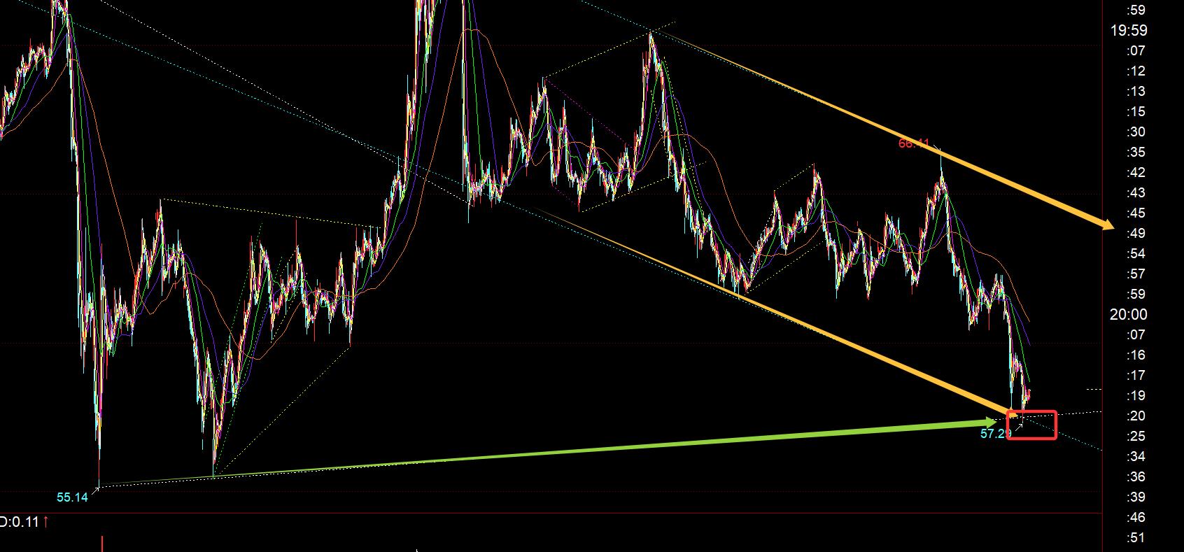 原油方面:黄色通道下轨和绿色趋势线支撑共振点,昨晚基本试探了,且出现一些反弹,这个周视频中已经提及了;那么接下来就看反弹力度,阻力60、61.4不变;