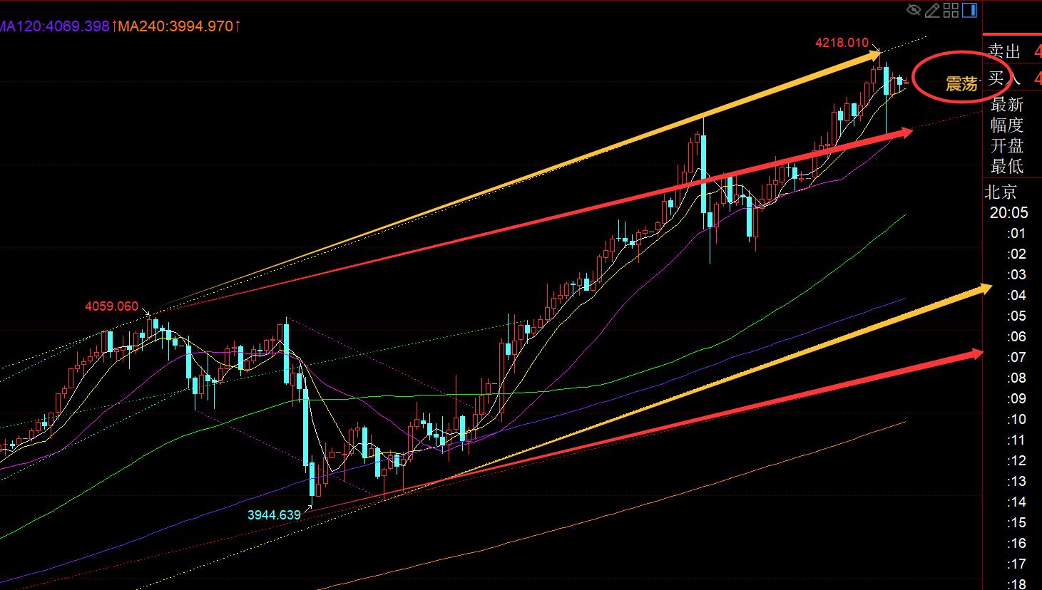 第二,黄金4小时级别:此周期一旦走逼空拉升,也是连阳单阴局面,且依托5日,极限10日支撑不断上拉破高;今晚5日支撑关注4180,10日支撑关注4156,这只是22点前对应的位置;22点一过,支撑会10米速度逐步上移;只有有效跌破失守10日,那么短线才能迎来一波稍大的回调,去试探中轨,今晚预计不太会,要等明日;