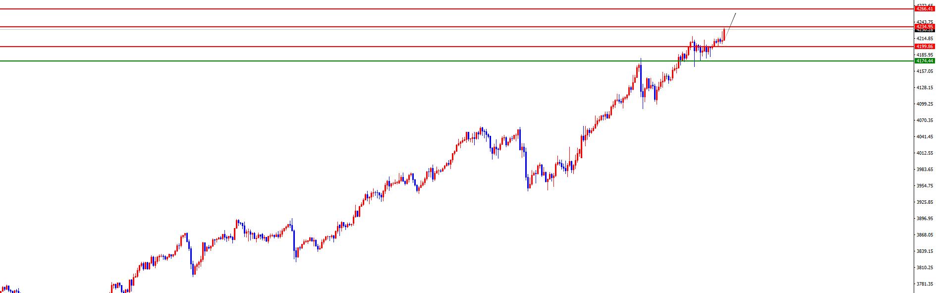 黄金早盘低点4199.73为日内分水岭,价格在此位置之上看多头延续(同时一小时出现背离,需要注意短线拉升后的风险)