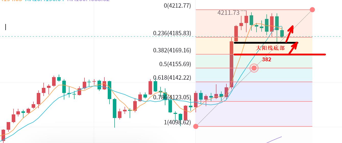 上升回撤382位置在4168-69一线。这是多头关键多头位,触及多。