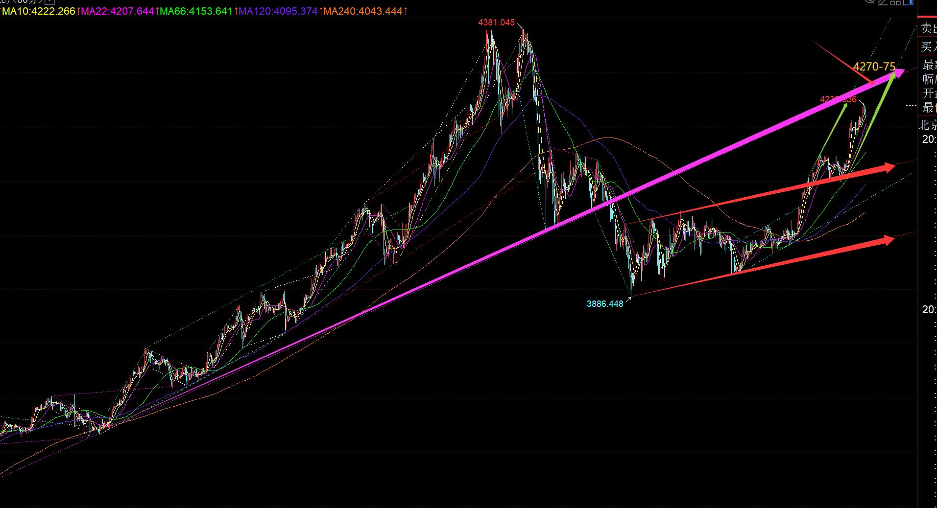 第一,黄金日线级别:昨日继续收报阳K,今日不算,当前已四连阳,中途并未出现压制回踩修正收阴,那么这一波就是想一口气单边涨到位,这两周一直强调,后面至少次高点去试探4192,属于4381-3886的618分割位置,昨晚直接实现到位,并且压根没丝毫承压,直接越过,那么下一个要测试的是786分割位置4275;参考4月份3500压制之后的次高点反弹力度,当时刚好也是786处承压,展开一段时间的大收敛三角,这次会不会雷同再演绎一次呢,是接下来需要观察的;