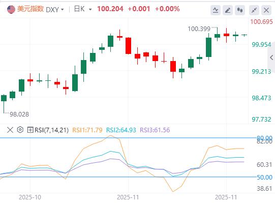 11月25日,北京时间周二亚市早盘,美元指数徘徊在100.20附近。周一,美元指数高位震荡,企稳在100关口上方,最终收涨0.025%,报100.2;美债收益率普跌,基准的10年期美债收益最终收报4.031%,对美联储政策利率敏感的2年期美债收益率收报3.51%。受市场对美联储下月降息预期增强的提振,现货黄金大幅走高,一度较日低涨近100美元,最终收涨1.69%,报4134.79美元/盎司;现货白银最终收涨2.64%,报51.36美元/盎司。鉴于俄乌达成和平协议的关键症结仍未见进展,国际原油结束三日连跌。WTI原油逼近59美元关口,最终收涨1.67%,报58.89美元/桶;布伦特原油最终收涨1.39%,报62.79美元/桶。