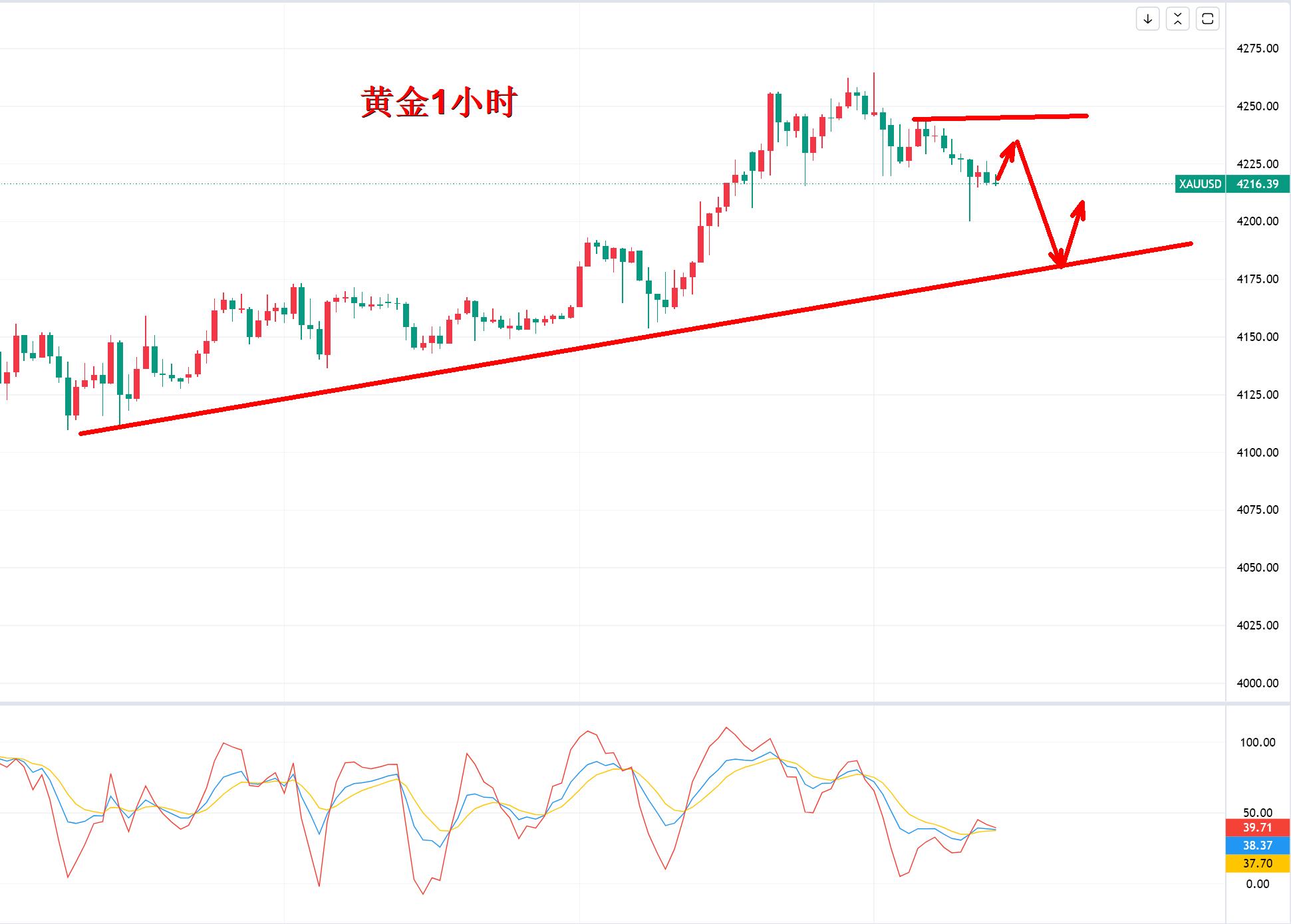今天,黄金面临震荡式下跌,这也是上涨过程中的洗盘行为,多空分界点在4250美元的位置,上涨分界点看支撑,下跌分界点看压力,向下看到4190-4182美元的范围。