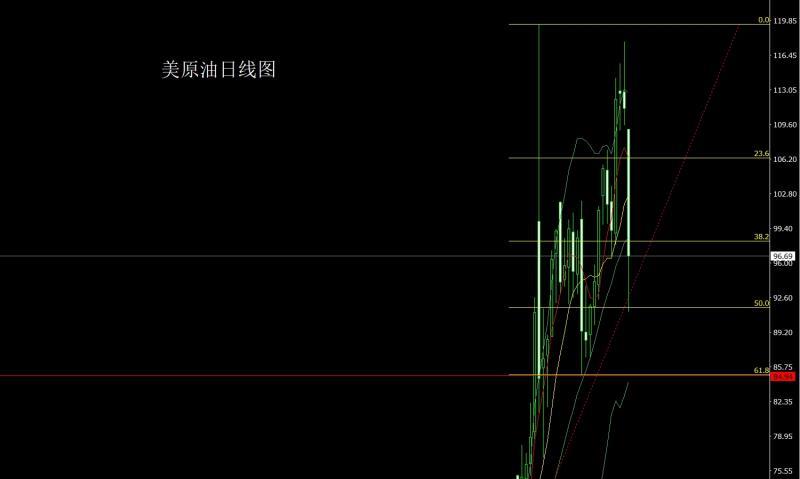 美原油市场昨日低开在109.12的位置后行情直接回落,日线最低给到了91.15的位置后行情超跌反弹,日线最终收线在了96.69的位置后日线以一根下影线极长的大阴线收线,而这样的形态收尾后,今日的行情93.3多止损92.8,目标看96和98和99-100离场准备空
