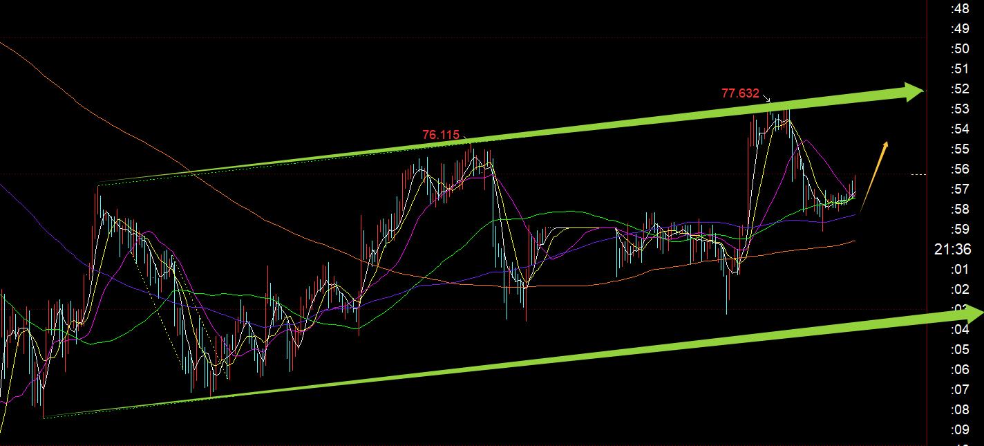 白银同理,也是一个震荡上行通道,守住下轨即可;今晚74.2上支撑,阻力看75.7-76、77.7;