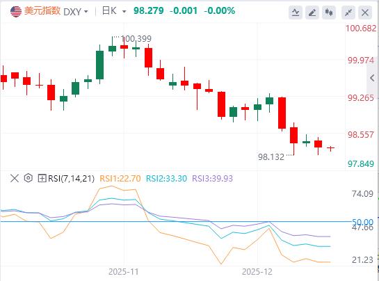 ABD dolar endeksi: Haberin yayınlandığı an itibarıyla ABD doları 98,27 civarında seyrediyor. Piyasa şu anda yıl sonu ticaretinde kritik bir kavşakta. Yatırımcılar geçen haftaki Federal Reserve faiz oranı toplantısının sonuçlarını sindirirken, aynı zamanda yaklaşmakta olan gişe rekorları kıran ekonomik verileri de yakından takip ediyorlar. Bu hafta piyasa, hükümetin kapatılması nedeniyle ertelenen Kasım ayı tarım dışı istihdam raporunun yanı sıra tüketici fiyat endeksi gibi önemli verileri açıklayacak. Bu bilgi piyasaya ekonominin daha net bir resmini sunacaktır.Temel resim. Fed'in politika yolunun yeniden değerlendirilmesi bağlamında, ABD dolarının mevcut seviyesini koruyup koruyamayacağı veya Haziran ayından bu yana aralığın alt kenarına doğru ilerleyip ilerlemeyeceği piyasa için temel bir konu haline geldi. Teknik olarak ABD doları endeksi için en yakın destek seviyesi 98,00 ile 98,15 arasıdır. 98,00 seviyesinin altındaki bir kırılma, ABD doları endeksini bir sonraki destek seviyesi olan 97,35 ila 97,50'ye doğru itecektir.