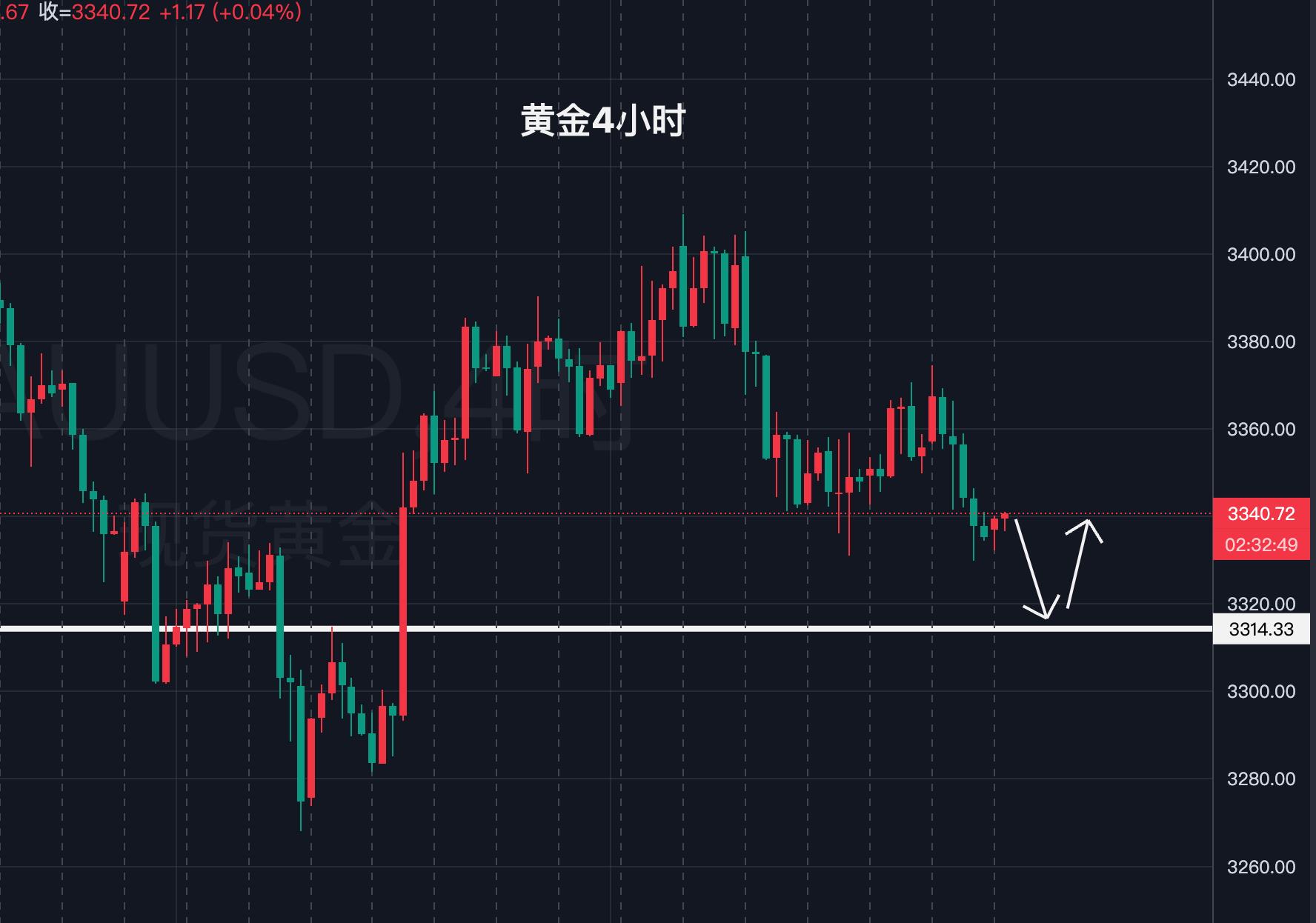 4小時,本週以下跌調整為主,週一沖到3405美元後歐盤回落破位3380美元,之後周二也是以3360為壓力延續下跌,週三反彈向上挑戰3370,週四昨天佯攻3375之後深調回調,今天下面關鍵的支撐在3315附近,也是相對比較極限的位置,雖然美俄談判可能有變數,但技術面仍然偏空,要小心美俄釋放假和解引發市場拋售。
