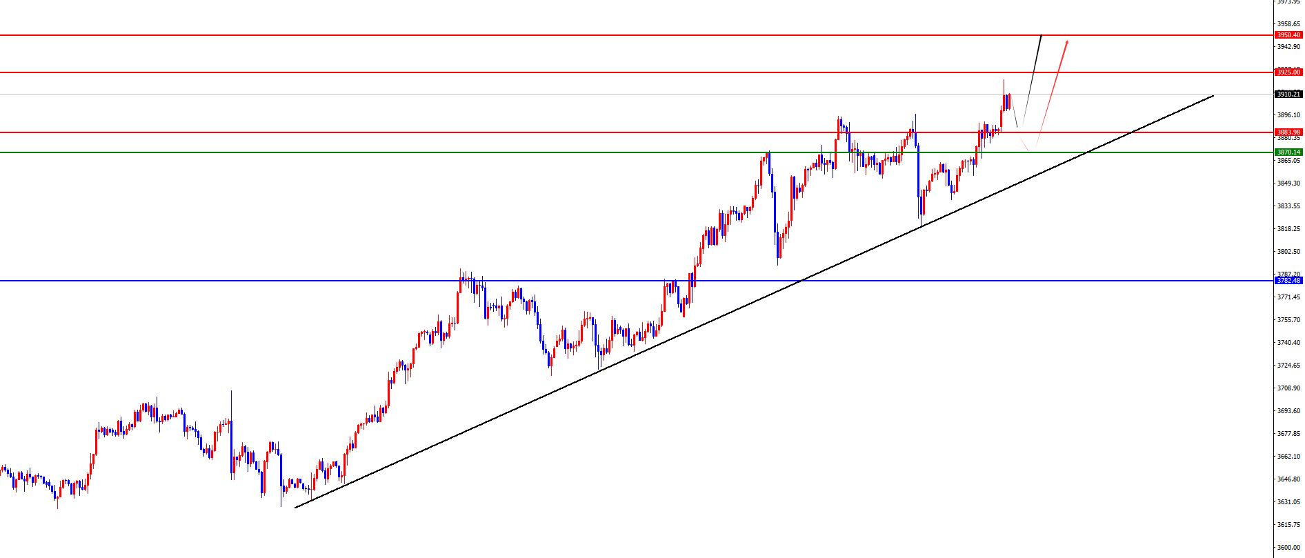 From multi-cycle analysis, first observe the monthly rhythm. From the long-term perspective, the 3130 position is the watershed of the long-term trend. The price can be treated more in the long-term. From the weekly level, the current weekly long and short watershed is at 3531, and the price is above this position and the medium line can be treated more. From the daily level, we need to pay attention to the 3782 regional support for the time being. The band above this position is treated more often, and we will continue to treat the right-hand trading method. From the four-hour perspective, there are two ways to go up the price in the past four-hour period. The first is that when the price is far away from the daily support, the price rises based on the four-hour support. The price breaks down to the four-hour support and does not continue, but continues to rise after breaking down to the four-hour support. Second, when the middle is closer to the daily line, the price rises after testing it to the daily line support. The price was obviously the first case last Friday. Currently, we are temporarily paying attention to the two support 3875 and 3884 in four hours. In one hour, the early trading session will be directly broken through the 3900 position again. At present, the short-term early trading low becomes the key. Radicals maintain long before the early trading low is broken. Conservatives can rely on four-hour support to see the rise.