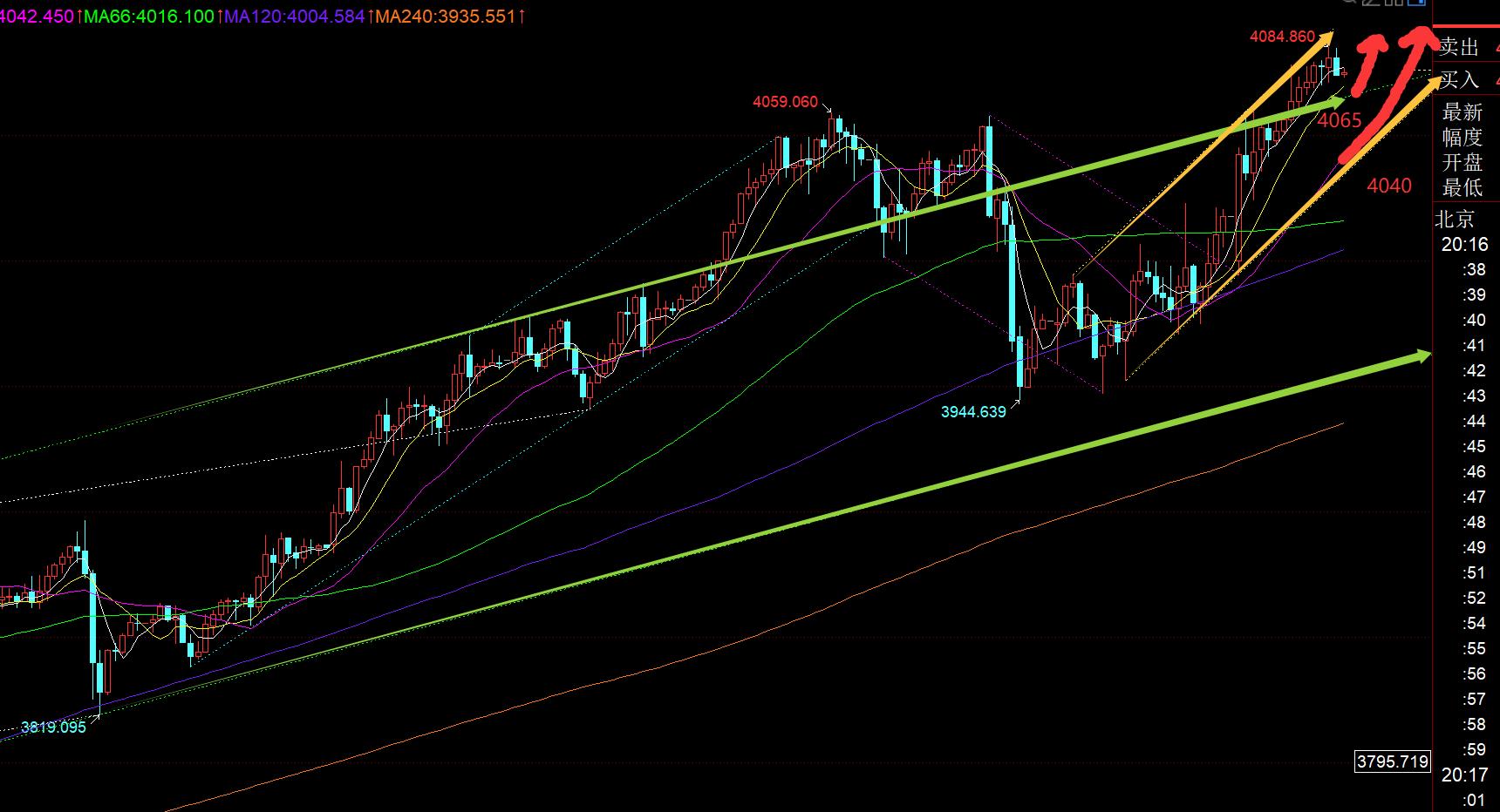 Third, the golden hour line level: early in the morning, it quickly stepped back on 3995 and then rose rapidly. After breaking through 4010, it closed at 4060, which was hit by the sun. It took one hour to hit the mark; then after the day, it continued to be bullish by stepping back on 4020, and after 10 o'clock, it continued to be bullish by relying on the 5-day moving average of 4045, because it relied on the 5-day moving average to pull up. This is a typical example. A strong intraday unilateral move; therefore, the bullish breakthrough of 4061 was also ambush in advance. The 4060 position was under pressure twice last week, and was suppressed twice this morning. It is easy to continue to rise if it breaks through again, and finally succeeded in reaching the target, approaching the 4080 target; then after breaking through 4060, there will be a wave of rise, and the retracement confirms that it is the top and bottom position. 4060 is a bullish opportunity again, and the European market reaches 40 again 80 target; for tonight, the Asian and European markets have been rising all the way, and the US market has retreated for a wave and has a second rise, but we must be cautious, because today has risen 90 meters from the low to the high, which is the limit of 100 meters for the day, so try not to chase the rise, step back to the first support and focus on the 4065 line. In the figure, the upper track of the green channel in the early stage once again confirms the support level, followed by the middle track, which is also close to the yellow channel. On the lower track of 4040, I hope to step back more to make room for another rise in the day; otherwise, the high level will continue to trade strongly sideways, and it will continue to rise tomorrow; the resistance target will be 4090-4100, which is the extreme position today; remember, the principle of only being long but not short, do not look at the decline easily, every day will witness extreme moves that are rare in history;