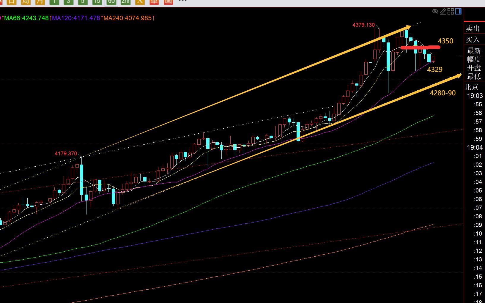 Third, the golden hourly level: From the picture above, it is currently in the yellow ascending channel, and the upper rail has twice been under pressure at the 4380 line. There is a certain double top, but it must fall below the low of 4280-90 in the morning to form an effective suppression of the M head; however, , the European market is in a period of continuous Yin and single Yang shock decline, and there are too many negative lines, suggesting that the downward kinetic energy is accumulating; the key support is the middle track, which moves up to 4329 at this time. Once the big Yin or the continuous Yin effectively breaks the position, it will basically continue to hit the market downward; if it breaks the intraday low, it can quickly point to The early retracement point of the 4220 first-line channel happens to be the position of the daily 5 moving average, and then observe whether it stabilizes. If the daily line is repaired in place, then the market outlook can boldly continue to hunt for dips and follow the trend to see the rise and rise; if 4220 cannot hold, then the downward trend is 4162; the resistance is clear, The pressure-bearing position of the node is 4350, which is the sideways position of the European market and the suppression point of the 10 moving average. If it breaks through again, it may be a repeated wash to touch the intraday high. You must also be prepared for this; in short, be careful of a wave of market correction tonight;