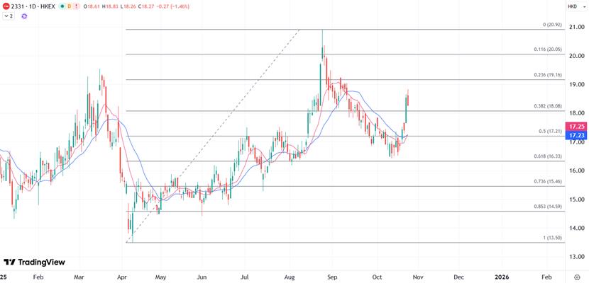 For example, Li Ning’s entry into the instant retail platform has put forward higher requirements for store picking, packaging efficiency and staffing. If the process is not managed properly, it can increase the operating costs of a single store. Instant retail platforms usually charge a certain xmaccount.commission, and promotions may be more frequent. You need to pay attention to their final impact on the net profit margin of the product. Li Ning's stock price rose significantly overnight in the U.S., but Hong Kong stocks failed to follow suit today, setting a new high since September 10 and then retreating. If it closes below HK$18 during the day, it will face pressure to fall to HK$17.20. At that time, attention will be paid to the key support formed by the main moving averages on the daily chart.