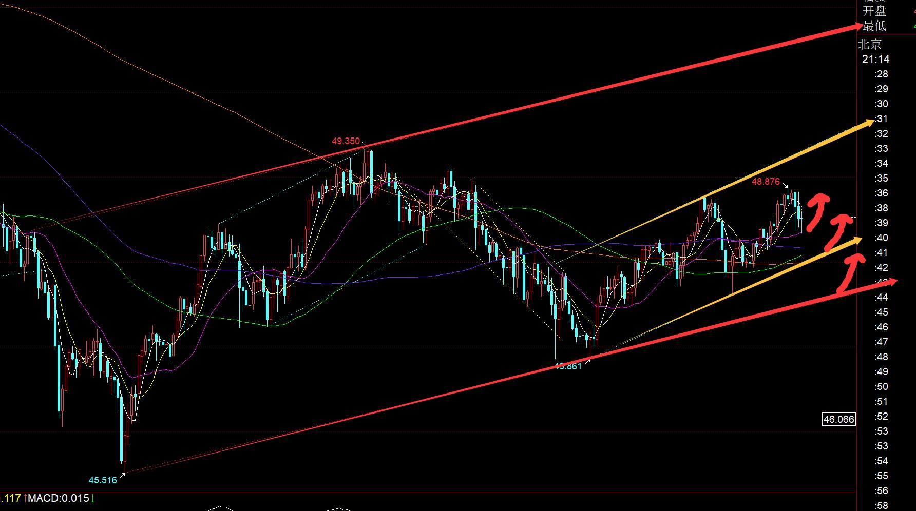 Plata: en la imagen de arriba, también está en el canal ascendente del canal rojo, mientras que el canal pequeño está en el canal ascendente amarillo. El soporte horario actual en el carril central es 48,35 y el soporte dividido intradiario 618 es 48,3. En primer lugar, preste atención a la estabilización de su apoyo; mientras que el soporte del riel inferior del canal amarillo es 48. También hay un rebote estabilizador en esta posición. Si es más débil será el soporte del carril inferior del canal rojo 47.6; Por lo tanto, en caso de shocks, preste atención a las señales de soporte y estabilización de estos tres lugares esta noche. Si prueba la parte inferior y levanta K o Dayang K, puede intentar intervenir y probar si retrocede en la próxima hora. La resistencia es 48,85 y 49,4;