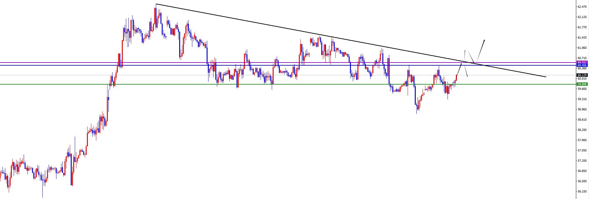 El precio está en 59.80 Lo anterior es alcista, y se prestará atención de seguimiento al desempeño de los avances de resistencia diarios y semanales