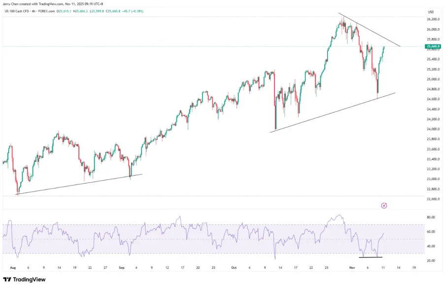 Se espera que la liquidez del mercado regrese si el gobierno de Estados Unidos reabre sus puertas. Al mismo tiempo, Trump incluso dijo que consideraría emitir un "dividendo arancelario" de 2.000 dólares estadounidenses para la mayoría de los estadounidenses. Se espera que el optimismo siga estimulando la subida del índice Nasdaq 100 a principios de esta semana.