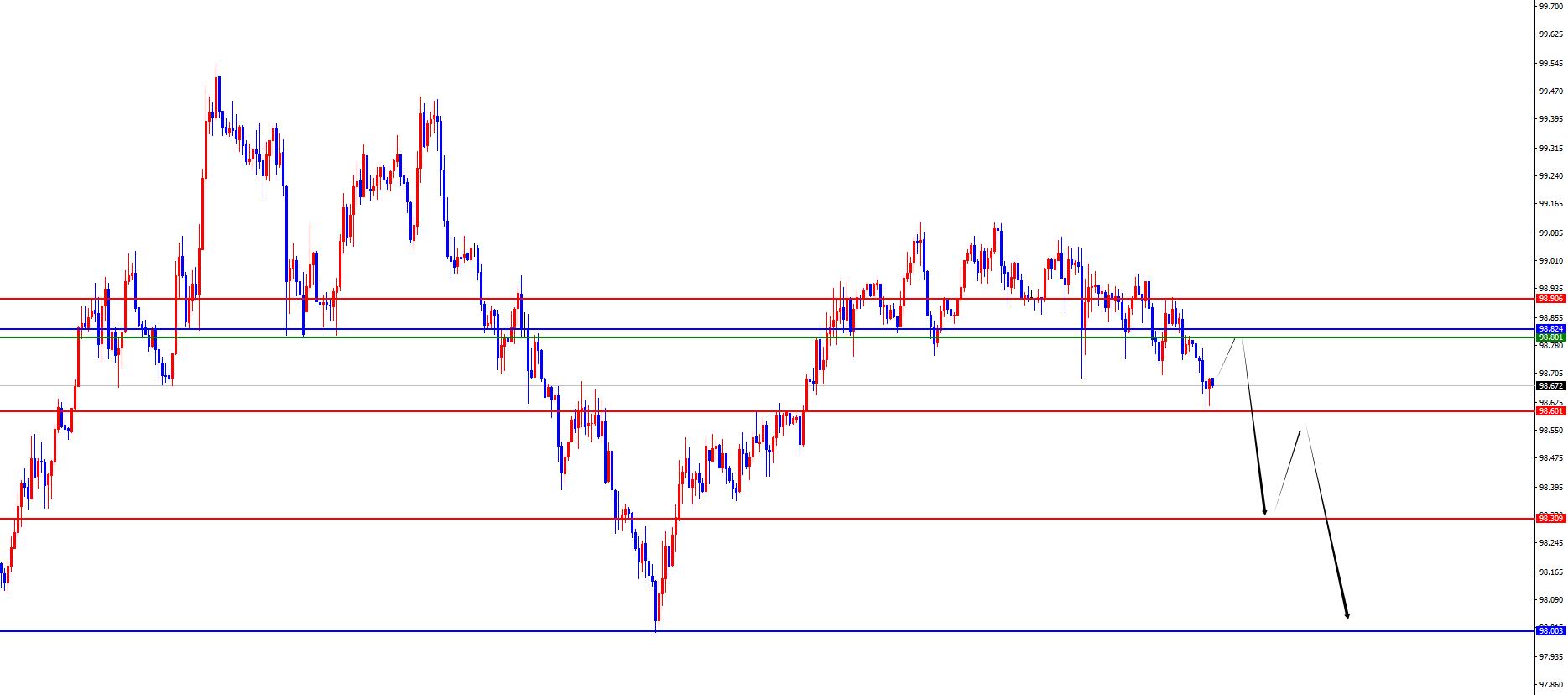 从多周期分析,周线价格经过前期持续震荡但是整体受撑于周线关键位置,目前周线支撑于98区域,后续关注进一步中期多头(需要注意缺口位置)。从日线级别看,随着时间的推移目前日线阻力于98.80区域,此位置是波段走势的关键,目前价格已经进行下破,后续关注此区域持续承压。四小时级别看,昨日价格持续承压于四小时阻力位置,随着时间的推移目前四小时阻力于98.70-80区间阻力,后续关注此区域继续承压即可。