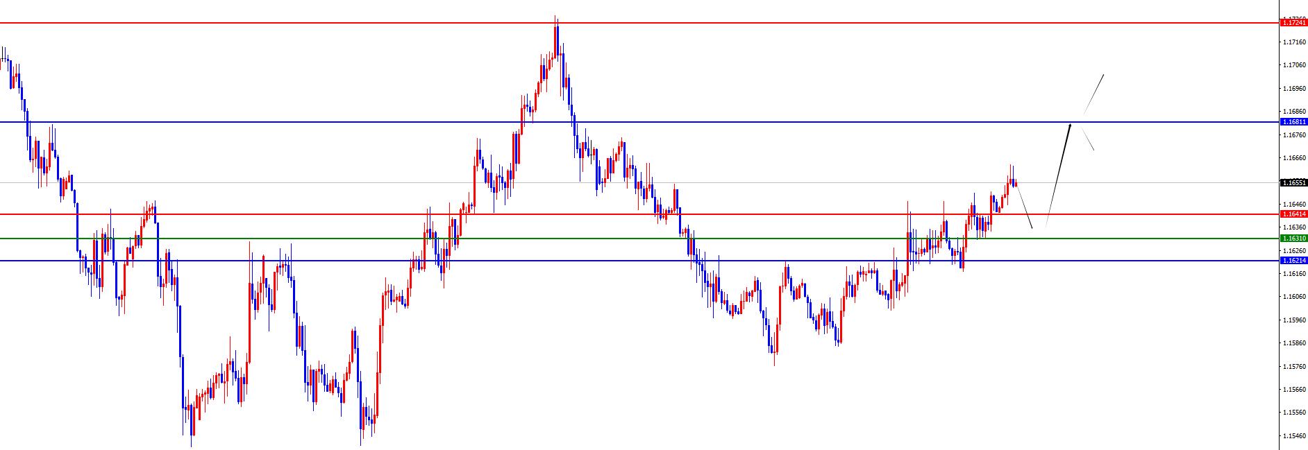 从多周期分析,从月线级别来看,欧美受撑于1.1100位置,所以价格在此位置之上长线多头对待。从周线级别看,周线阻力于1.1680区域,此位置是中线走势的多空分水岭,价格在此位置之下中线偏空对待。从日线级别,日线上是我们强调波段走势的关键,价格在上周五突破1.1620阻力位置,后续关注价格延续上涨。从四小时级别看,价格在上周四晚间突破四小时阻力位置,之后价格维持短期上涨,目前四小时支撑于1.1630-40区间支撑,后续关注此区域支撑价格继续上涨,上方重点关注日线阻力1.1680区域得失,一旦上破则关注进一步延续,后续我们再做实时跟踪。