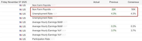 本周五21:30,如果美国政府结束停摆,美国劳工部劳动统计局将公布10月非农就业报告;如果美国政府停摆延续,非农就业报告恐无法准时公布。如果非农就业报告公布,其中最受关注的指标是新增非农就业人口,前值为2.2万人。这里所说的前值并不是9月份数据,而是8月份数据。因为美国政府停摆在10月1日开始,而9月份的非农就业报告本应在10月3日公布,这一天美国劳工统计局仍在停摆,所以未能如期公布。金融机构的预期值是5万人,高于前值2.2万人,但远低于15~25万人正常水平。即便公布值达到预期,也难以提振市场信心。由于大非农公布时间存在不确定性,所以市场关注焦点转向本周三的小非农数据,前值为-3.2万人,预期值2.4万人,预期虽由负转正,但绝对值仍偏低,美国就业市场前景偏悲观。