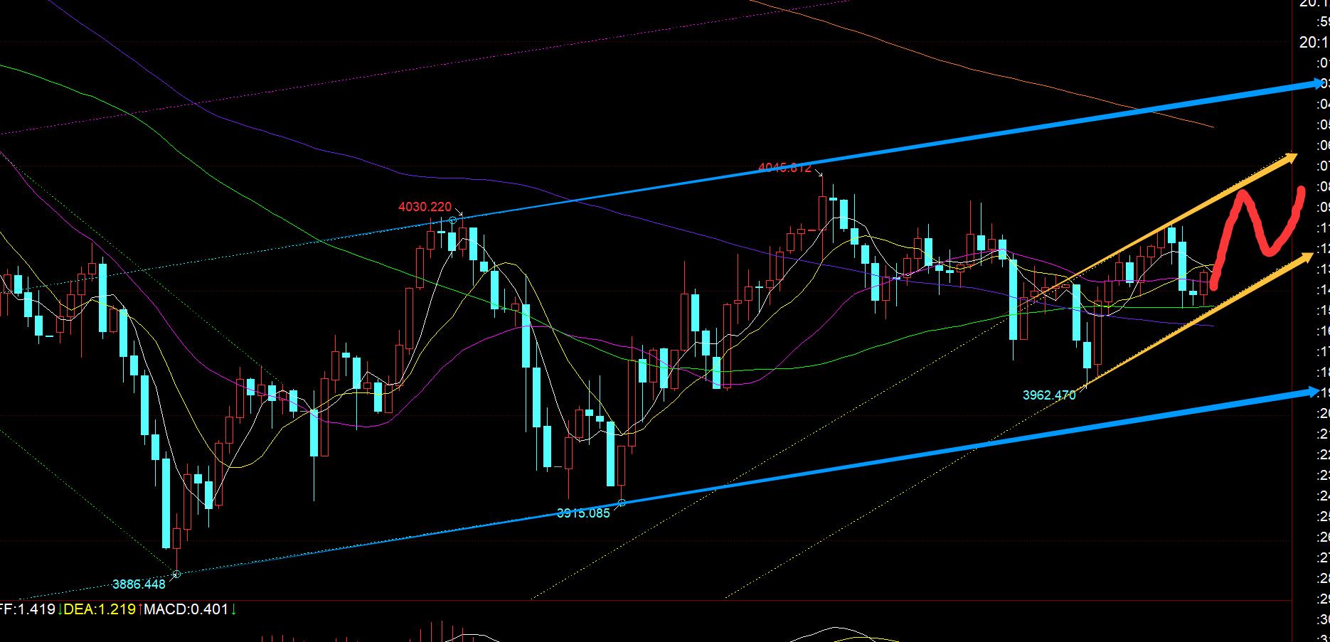 第一,黄金方面:日线级别当前是符合周视频指出的震荡,围绕5日和10日之间争夺整理,早间刺破5日是一个假动作;所以,最终要看收盘的有效性,10日阻力下移4036-38,5日支撑3983;