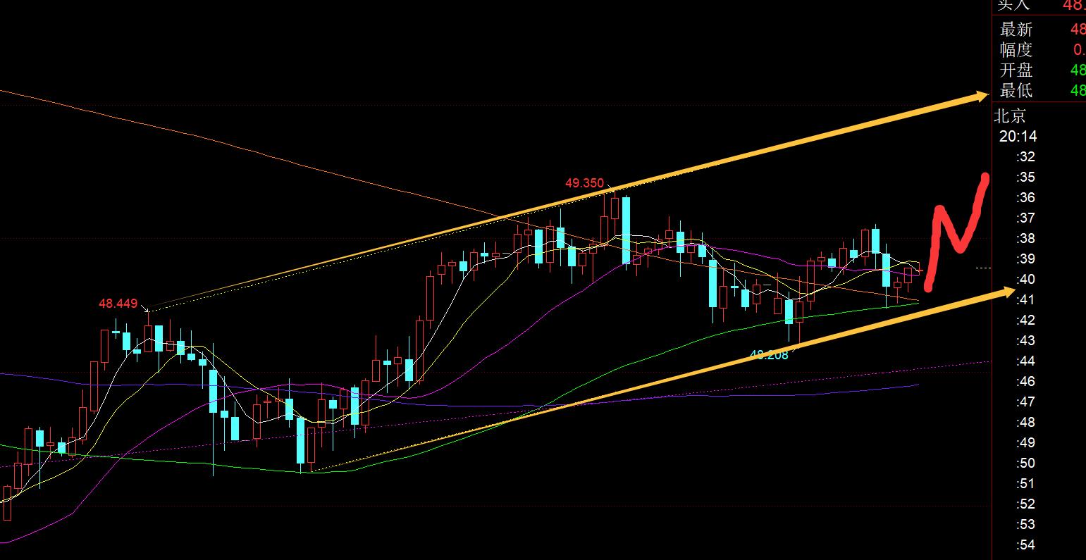 第二,白银方面:对于白银,日线级别是中轨压制49.45,5日和10日共振支撑于48.2,所以也是震荡争夺中;从上图看,也有一个黄色上行通道,下轨支撑今晚留意48.5-48.6上,小时线中轨也有所突破,和黄金走法雷同,倾向于稳住中轨震荡上行反弹,然后再冲高回落,慢慢磨上行通道内;