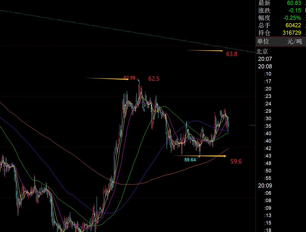 第三,原油方面:也是震荡,阻力62.5、63.8,支撑59.6,区间内运行对待;
