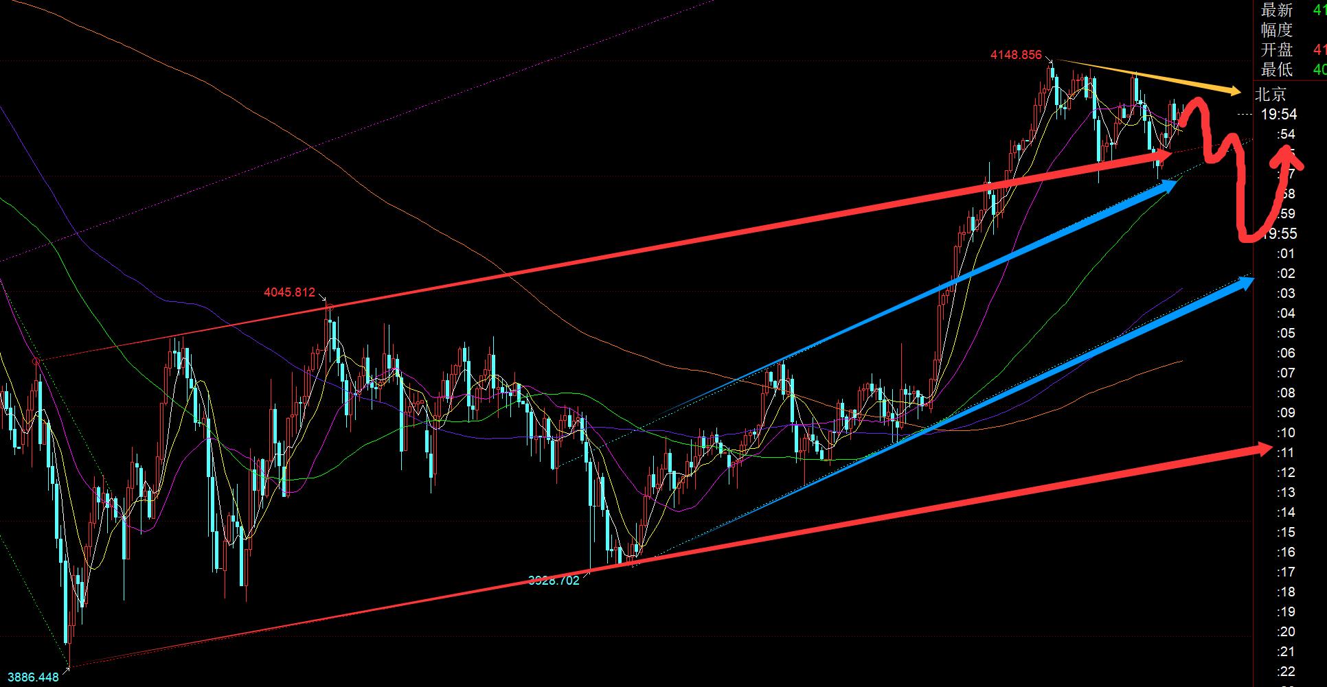 第一,黃金日線級別:昨日收報小陽,作為前日大幅拉升大陽之後,它是有些開始滯漲,或展開震盪橫盤,或存在一波回落修正;至少中軌4085一線是需要回踩確認的,另外一旦跌至4085,估計今日可能5日4066一線也要試探;至於頂底轉換位置4045-40支撐,這個暫時不好說,它可以確認完中軌或5日之後拉升一波再下去試探頂底位置,也可以一口氣試探頂底位置再拉升上攻;只不過後者來講,可能會破壞常規的五浪上漲形態;所以,接下來傾向於回踩確認中軌或5均線支撐再企穩震盪拉升一波去出一個次高點4192-4200,極限4275,然後再衝高回落去確認底部支撐,慢慢擴展進行大收斂三角整理,最終通過時間換空間的走法,年底或明年初去刷歷史新高延續大牛市;